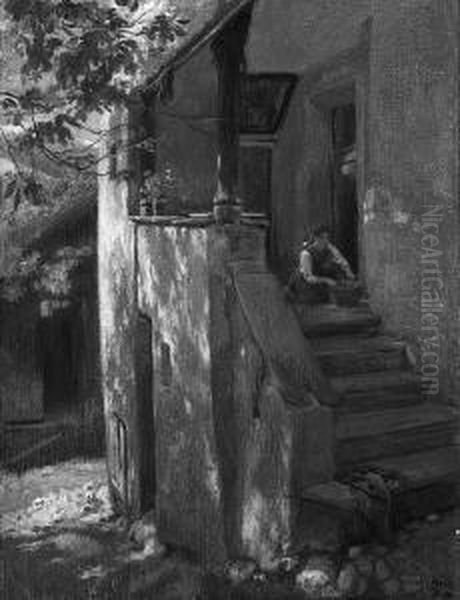 "madchen Auf Der Hintertreppe Eines Sudtiroler Bauernhauses". Sign. Ol Auf Lwd. 53,5 X 4 Cm. Rahmen