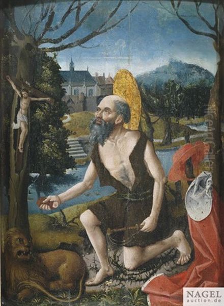 Der Busende Hieronymus. Der Auf Dornen Knieende Buser Mit Einem Stein Und Einer Geisel, Links Und Rechts Von Ihm Seine Attribute Lowe Und Kardinalshut