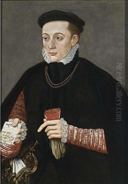 A Portrait Of A Young Nobleman From The White Family, Standing Half-length, Wearing A Red Coat With A White Shirt Under A Black Coat, Holding Gloves