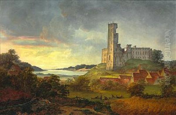 Prospect Af Colding Slots Ruiner Med En Deel Af Byen Og Dens Omegn, Seet Fra Den Sondre Side. Aftenbelysning