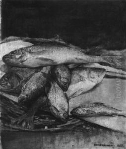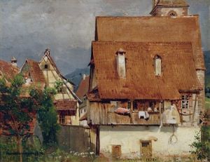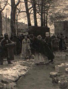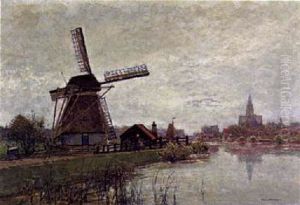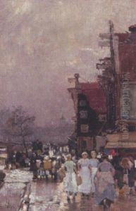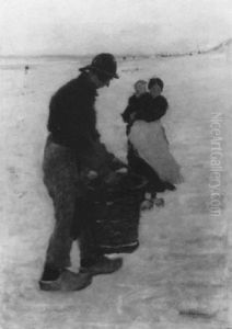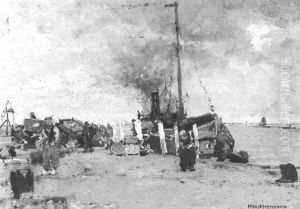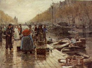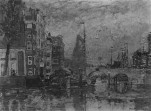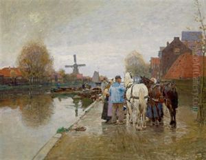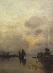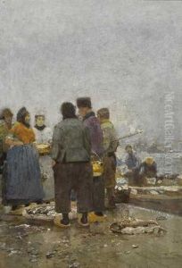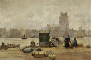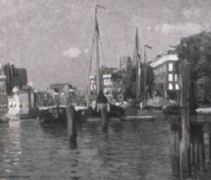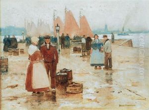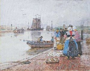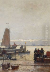 A Dutch Fishing Village At Dusk With Figures On A Quay