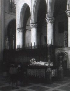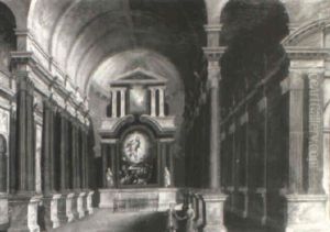 A Church Interior With Elegant Gentleman Conversing And Dogs Playing