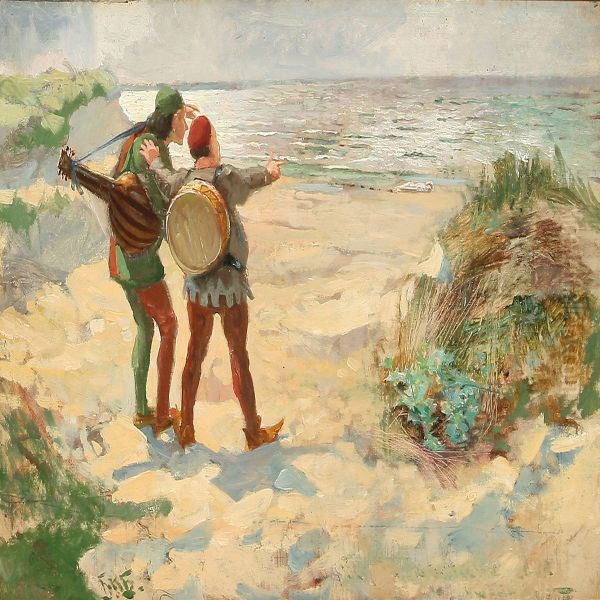 Coast Scene With Two Musicians Staring At The Sea