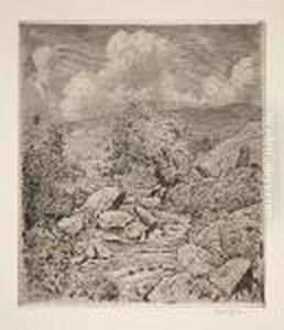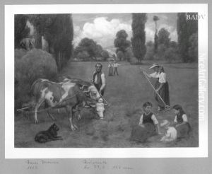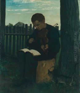 Auf Einer Bank Sitzender Knabe Mit Geranientopfen Und Weidenkorb