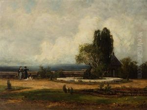 Italienische Landschaft. Im Schatten Eines Baumes Zwei Frauen Im Gesprach An Einem Brunnen