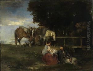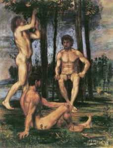 In 1864, von Marees traveled to Italy, which had a profound impact on his artistic direction. He settled in Rome, where he was deeply inspired by the work of the Renaissance masters. During his Italian period, Marees developed a more monumental and simplified style, often emphasizing the sculptural qualities of his figures and the harmonious arrangement of forms within his compositions. His palette became more subdued, focusing on earthy tones and muted colors.