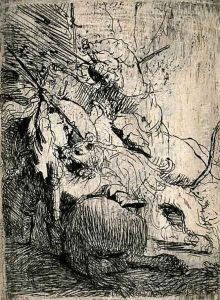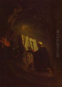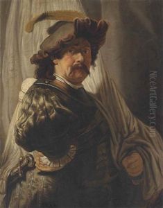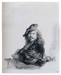 Half Length Figure Of Rembrandt In A Feathered Cap, His Eyes Cast In Shadow.