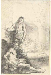 A nude Man seated and another standing, with a Woman and a Baby lightly etched in the Background