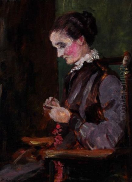A Study Of A Woman Seated In A Chair Sewing