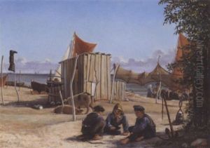 Sommerdag Pa Taarbaek Strand, I Forgrunden Tre Drenge, Der Spiller Et Spil