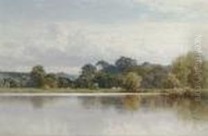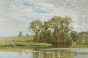 Tranquilsummer River Landscape, With Ducks, A Farm In The Woodland Beyond