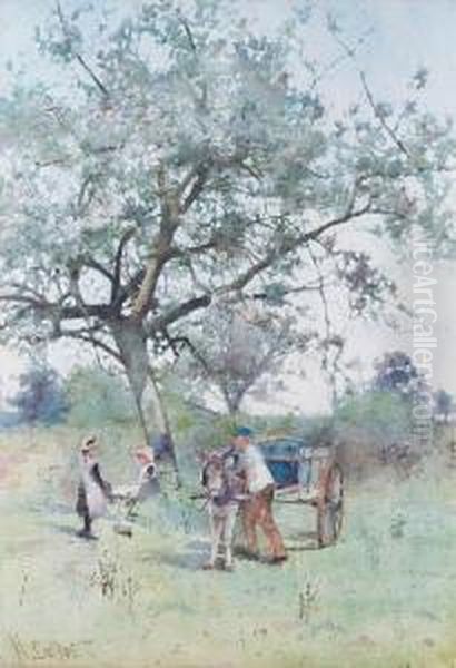 Children And Donkey Cart Before A Blossom Tree