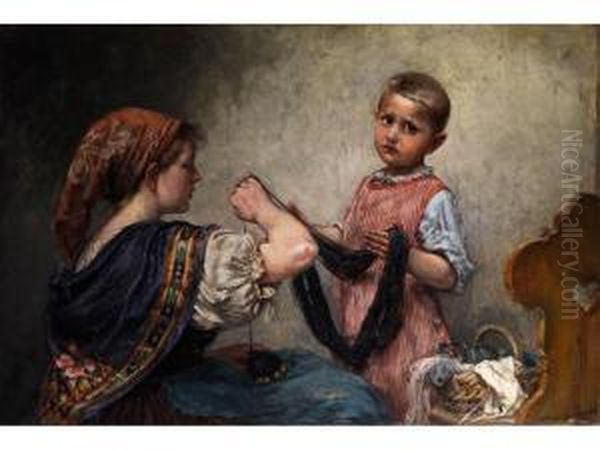 Junges Madchen Mit Einem Knaben Beim Wollgarn Aufwickeln