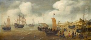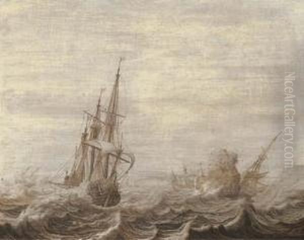 A Penschilderij: Three-masters Off A Rocky Coast In Choppywaters