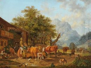 Oberbayerische Gebirgslandschaft Mit Malerischem Gehoft, Heimkehrender Viehherde Und Postillon Zu Pferd