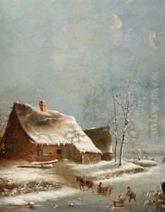 Winterlicher Bauernhof Mit Fuhrwagen Und Einer Gruppe Von Bauern Mit Schneeschaufeln