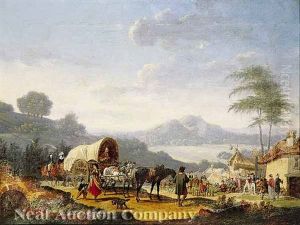 Postreiter In Lustiger Runde Vor Einem Wirtshaus, Daneben Zwei Packpferde