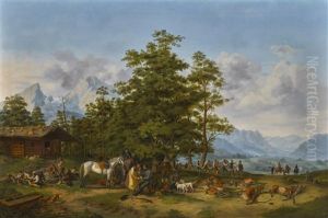 Wirtshaus Im Gebirge, Davor Zechende Bauern, Fuhrwerke Und Ein Hirte