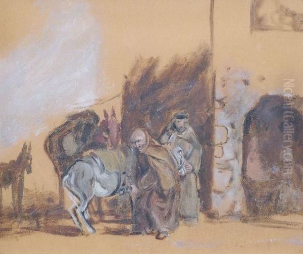 Zwei Monche Mit Ihren Reittieren Vor Einer Osteria