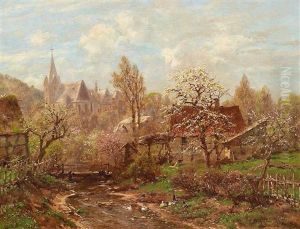 Niederrheinlandschaft Mit Einem Befestigten Bauerngehoft Zwischen Bluhenden Obstbaumen