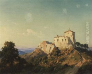 Italienische Landschaft. Alte Burganlage Auf Einem Hugel Im Abendlicht