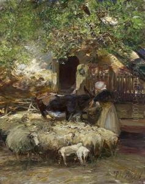 Magd Mit Schafherde Und Esel.