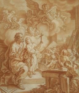 Maria Sitting With Christ And John The Baptist On A Parapet Above A River Landscape; Christ And The Holy Joseph Standing On A Hill Above A River (pair)