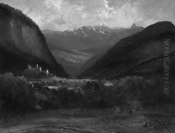 "blick In Ein Gebirgstal Mit Burganlage ". Sign. Und Bez. Munchen. Ol Auf Lwd. 74 X 96,5 Cm. Rahmen