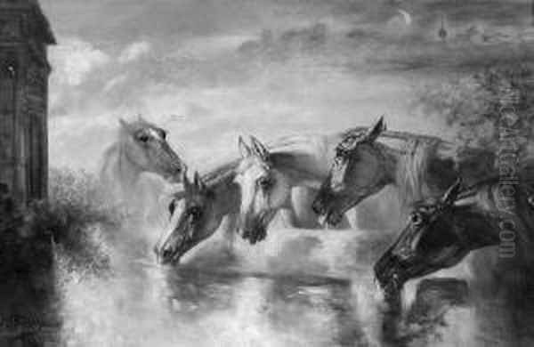H. M. "pferde An Der Tranke". Sign. Und Undeutl. Dat. 08 . Ol Auf Lwd. Min. Besch. 44,5 X 67,5 Cm. Rahmen