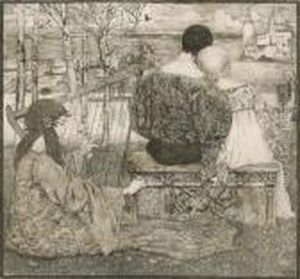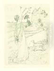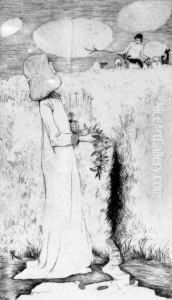 An Einem Bach Stehendes Madchen, Eine Blutengirlande In Handen Haltend