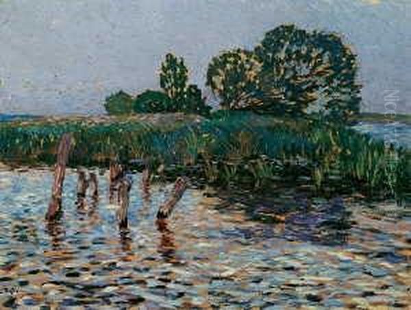 Ol Auf Karton 41 X 54,6 Cm, Gerahmt. Unten Links In Schwarz Monogrammiert Hv . - Ruckseitig Oben Mit Einem Alten, Grosen Papieraufkleber, Bedruckt "heinrich Vogeler, Worpswede/inhalt:", Darin Mit Blauer Kreide Handschriftlich Betitelt 'studie "an