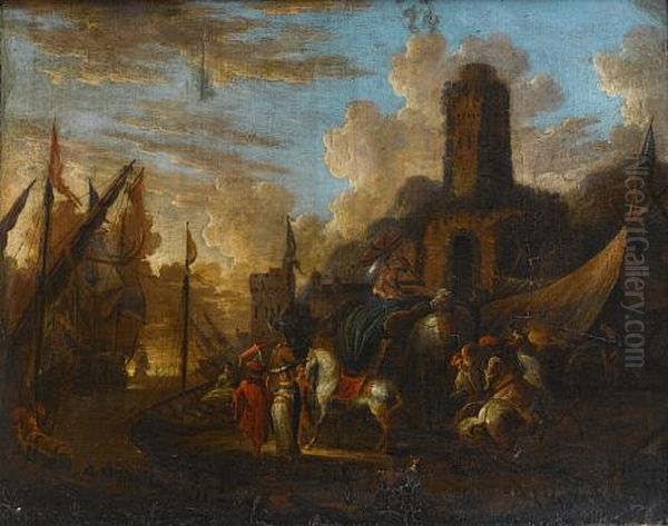 A Mediterranean Harbour With Elegant Figures On The Quay And Stevedores Loading Boats, Shipping At Anchor Beyond