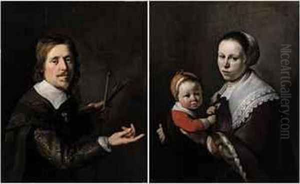 Portrait Of Gijsbert Gillisz. De Hondecoutre (1604-1653),half-length, Holding A Palette And Brushes; And Portrait Of Hiswife Maria Hulstman, Half-length, Holding A Child