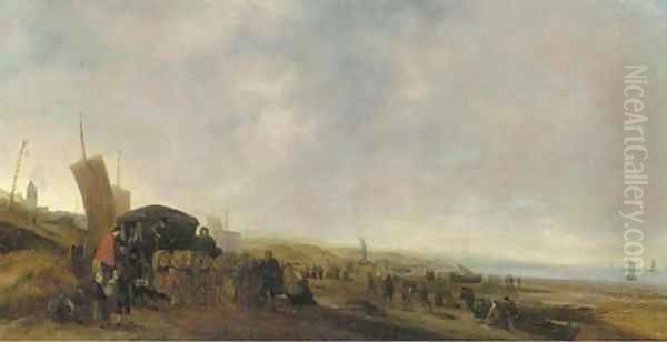 Elegant figures in a horsedrawn carriage with fisherfolk on a beach, sailing vessels beyond