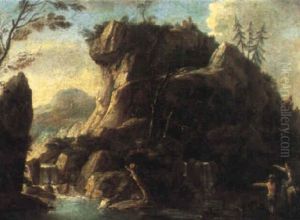 Rocky Landscape With Shepherds And A Goat By A Stream