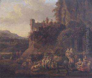 A Classical Landscape With A Herdsman And His Family Resting By A Fountain With Their Cattle And Goats