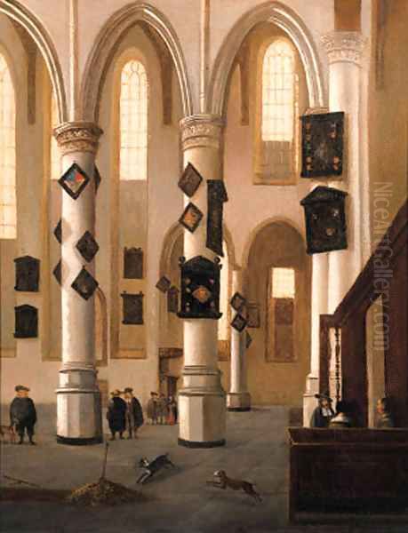 A view in the Oude Kerk, Delft, looking east from the Northern aisle, with townsfolk near an open grave
