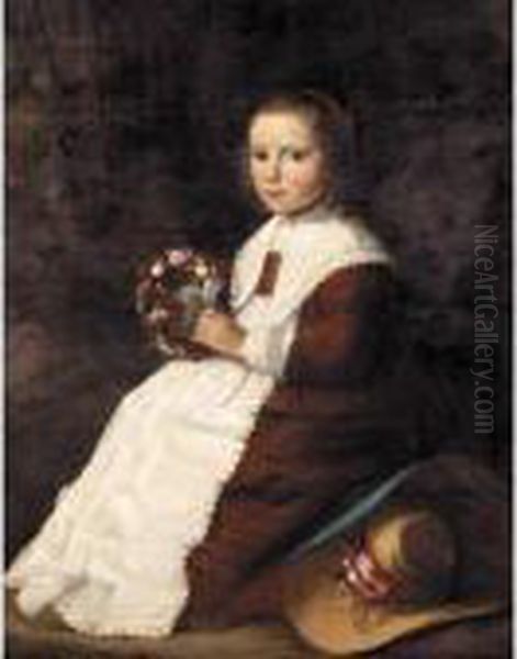 Portrait Of A Young Girl, Full Length, Seated In A Landscape, Wearing A Brown Dress And Holding A Garland Of Flowers