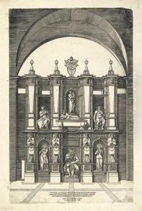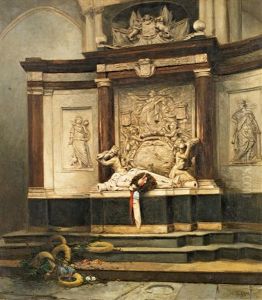 The interior of the Oude Kerk, Delft, with peasants and elegant townsfolk near the funerary monument of Admiral Maerten Harpertsz. Tromp