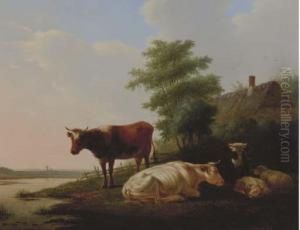 Drovers With Cattle And Sheep At A Farmhouse, A Town Beyond