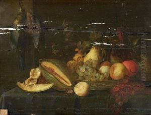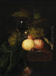 A Still Life Of Fruit And A Glass Of Wine Arranged On A Table Draped With A Rug