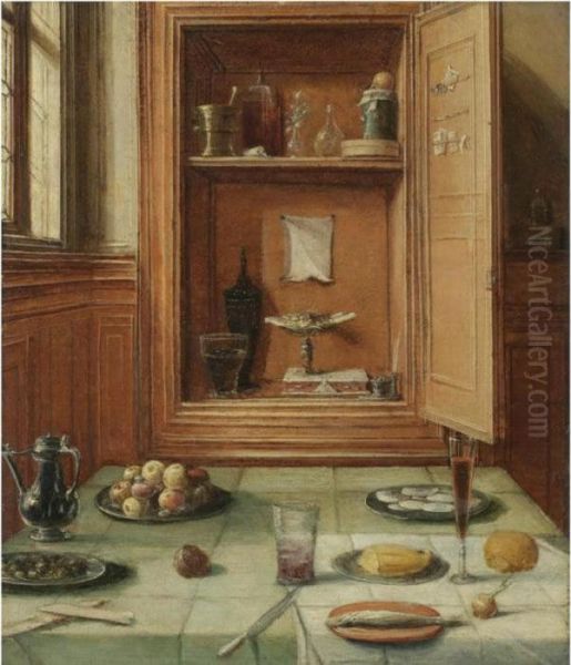 A Still Life Of Olives On A Pewter Plate, A Pewter Jug, Apples On A Pewter Plate, A Pomegranate, A Knife And A Glass, Together With A Herring On A Stoneware Plate, Bread On A Pewter Plate, A Flute Of Wine, Oysters On A Pewter Plate, A Bread Roll,