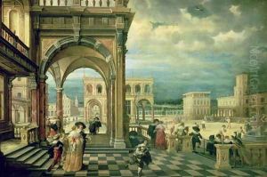 The Gardens Of A Palace, With Elegant Figures Strolling, Making Music And Playing Backgammon In A Loggia Oil Painting by Hendrick van, the Younger Steenwyck