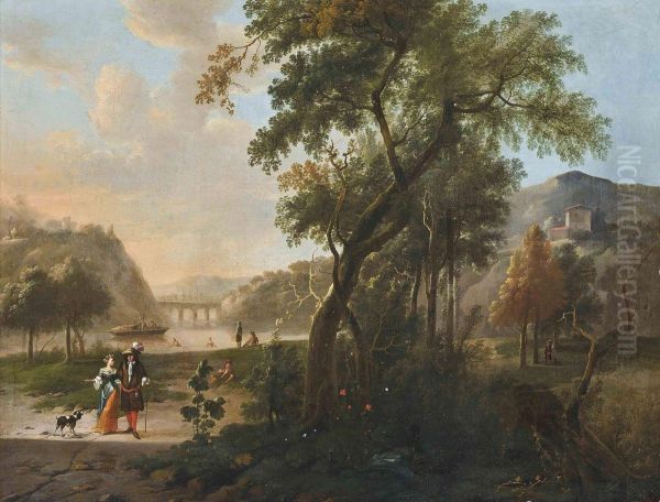 An Mountainous Wooded River Landscape With Elegant Company Conversing On A Track