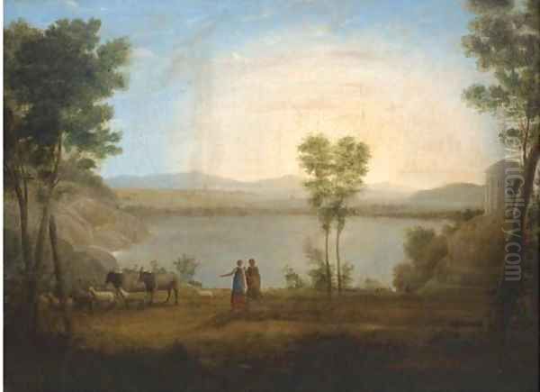 A classical landscape with a shepherd and shepherdess by a lake
