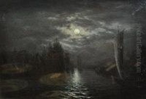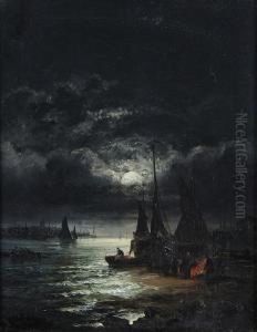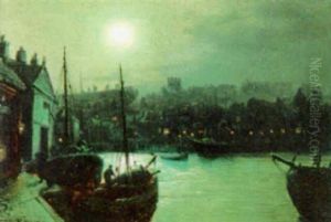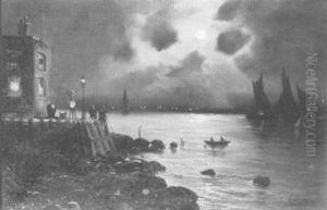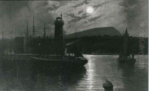 A Moonlit Harbour With A Ferry In The Foreground