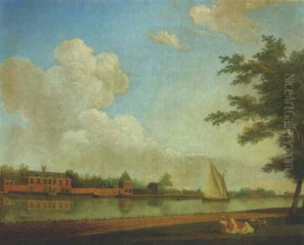 A Canal With Cattle Resting On A Bank, A Walled Mansion Beyond