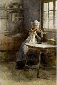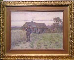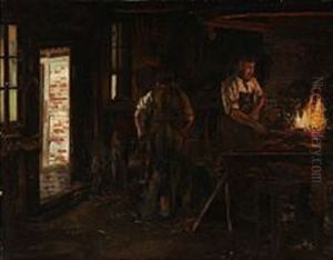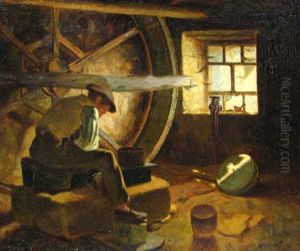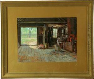Farmhouse With People Sharpening The Hand Tools