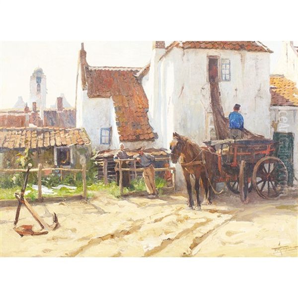 Farmer Loading A Horse-drawn Cart While Neighbours Chat
