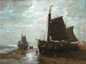 Bomschuiten In The Breakers And Fisherfolk On The Beach, At Night